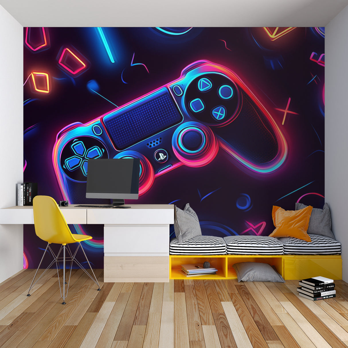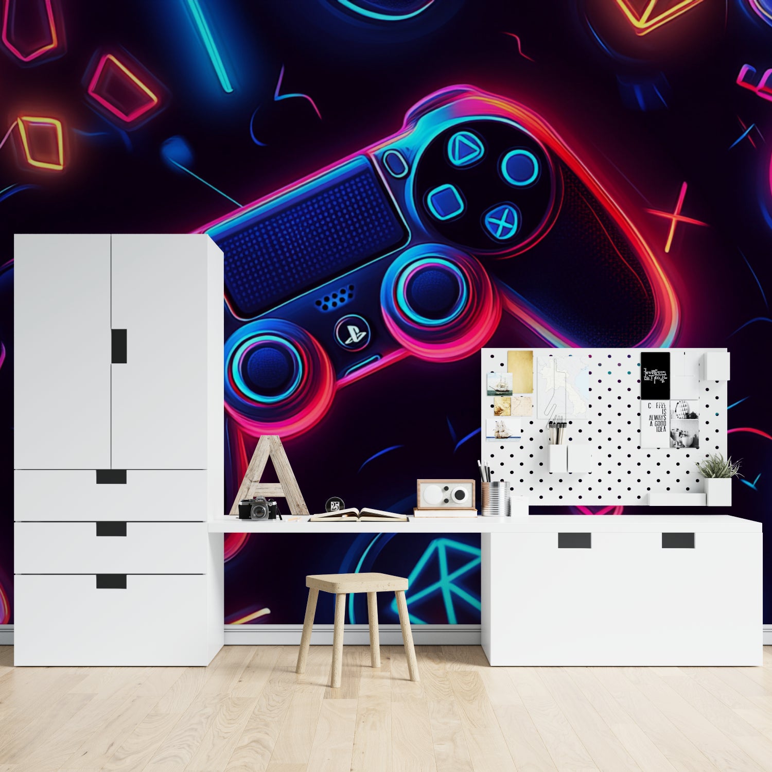 Dieses Gaming-Tapeten-Mural zeigt einen auffälligen, neonbeleuchteten PlayStation-Controller, der vor einem tiefschwarzen Hintergrund schwebt. Das Design besticht durch lebendige elektrische Blautöne, knallige Pinktöne und brillante Violettnuancen, die eine fesselnde Gaming-Atmosphäre schaffen. Die Tasten und Formen des Controllers leuchten mit einem intensiven Neon-Effekt, während geometrische Symbole im Hintergrund tanzen und ein modernes Gaming-Wanddesign erzeugen, das die Aufregung der digitalen Unterhaltung einfängt.