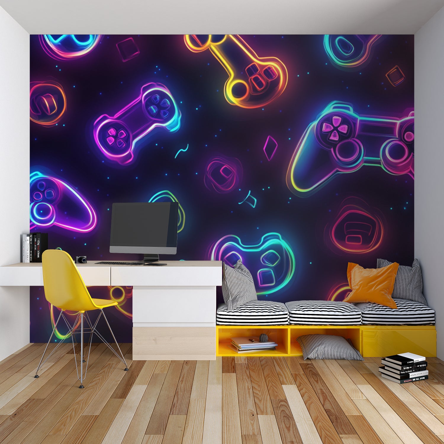 Diese Neon-Gaming-Tapete verwandelt Räume in lebendige Spielzonen.
