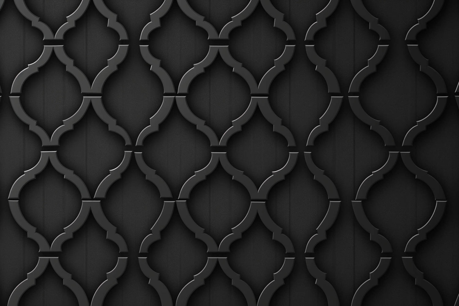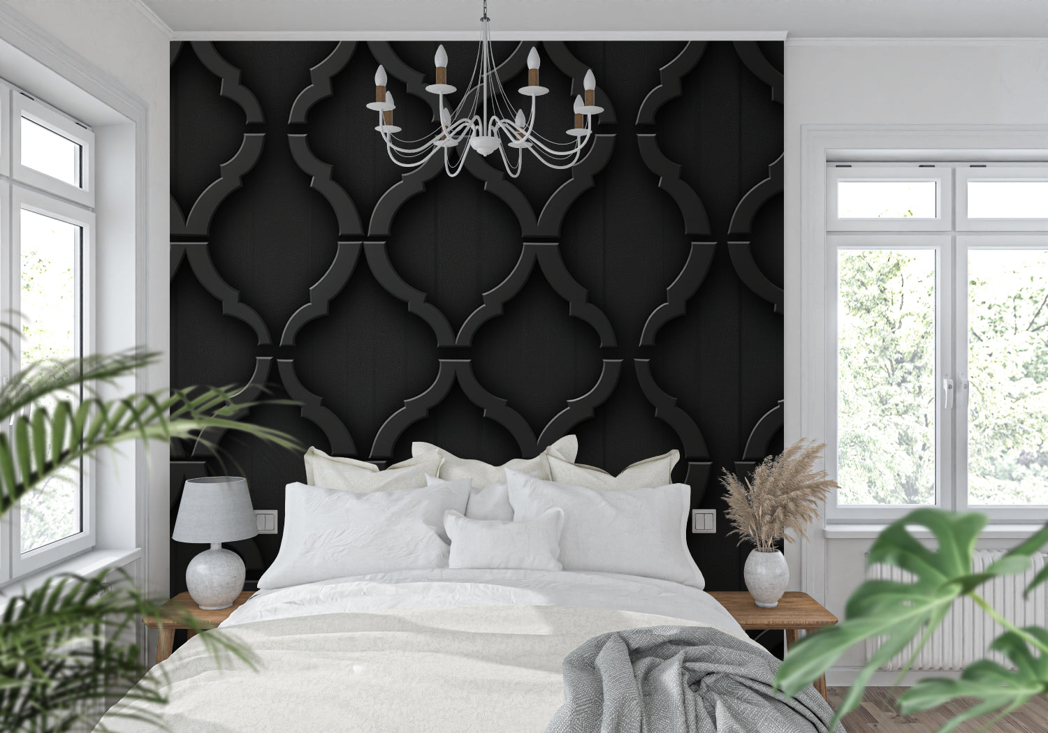 Diese 3D geometrische Tapete zeigt ein elegantes Gittermuster mit einem raffinierten dreidimensionalen Effekt. Der tiefschwarze Hintergrund schafft eine dramatische Leinwand für die erhabenen Vierblattranken-Motive, die subtile Schatten werfen, um die dreidimensionale Wirkung zu verstärken. Die moderne Gittertapete präsentiert eine meisterhafte Mischung aus zeitgenössischem Design und klassischer, von Marokko inspirierter Geometrie und schafft ein architektonisches Statement, das Aufmerksamkeit erregt.