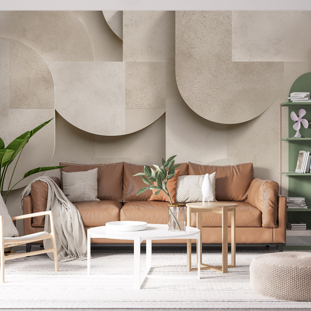 Dieses geometrische Tapetenmural zeigt ein raffiniertes Zusammenspiel von kreisförmigen Formen und subtilen Texturen auf einer warmen beigen Leinwand. Die großflächigen kreisförmigen Elemente erzeugen einen auffälligen dreidimensionalen Effekt, während die strukturierte Oberfläche das verfeinerte Aussehen von Naturstein nachahmt. Jedes geometrische Segment ist durchdacht angeordnet, um ein modernes abstraktes Wanddesign zu bilden, wobei sanfte Schatten der Komposition Tiefe und architektonisches Interesse verleihen.