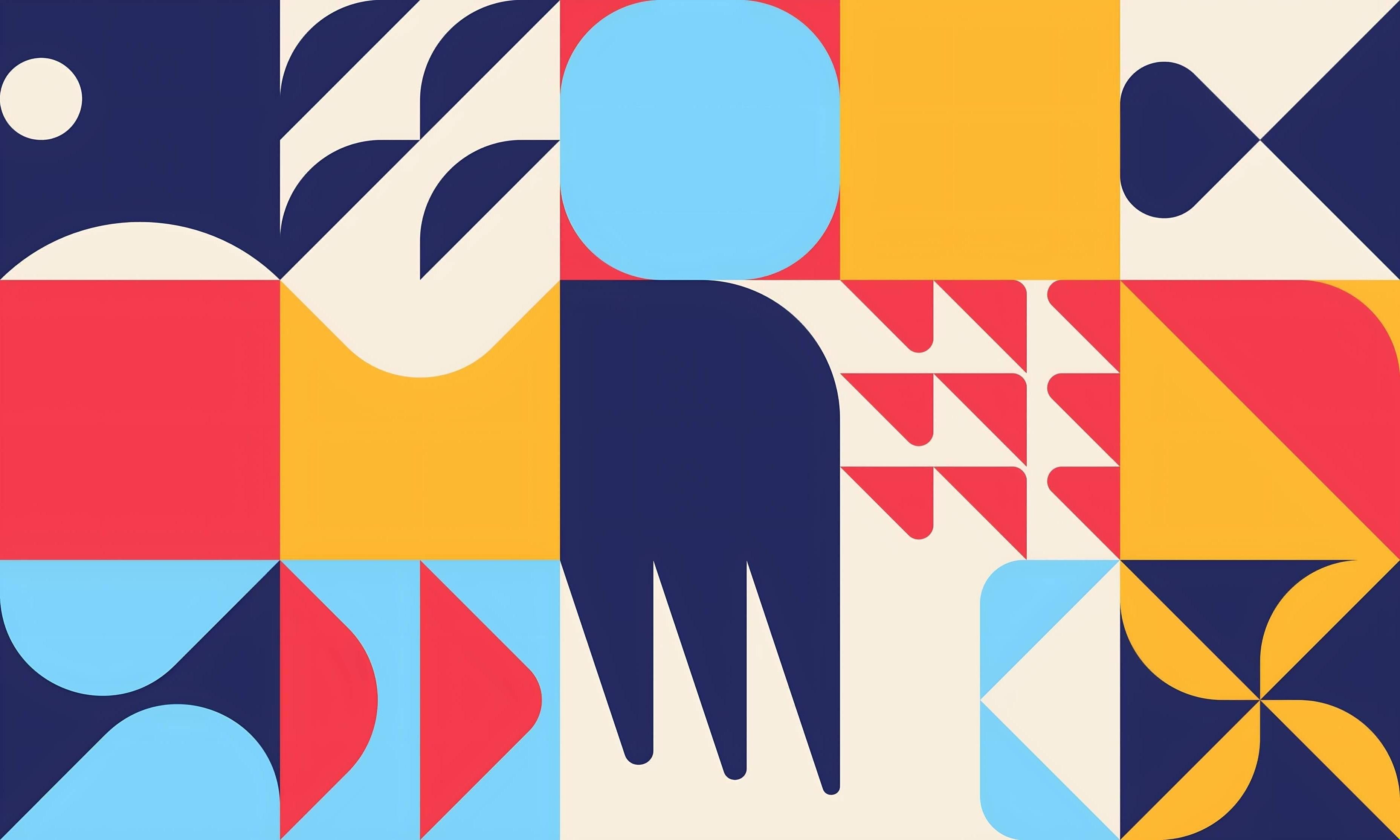 Dieses auffällige geometrische Tapetenmural zeigt eine meisterhafte Komposition aus kräftigen Formen und dynamischen Farben. Das Design präsentiert eine kunstvolle Anordnung von Marineblau, lebhaftem Rot, Sonnengelb und sanften Blautönen, die ein faszinierendes Muster aus Kreisen, Dreiecken und abstrakten Formen schaffen. Das moderne geometrische Wandmural demonstriert ein ausgeklügeltes Gleichgewicht zwischen geschwungenen und eckigen Elementen, während die sorgfältig ausgewählte Farbpalette durch kontrastreiche Farbtöne Tiefe und visuelles Interesse erzeugt.