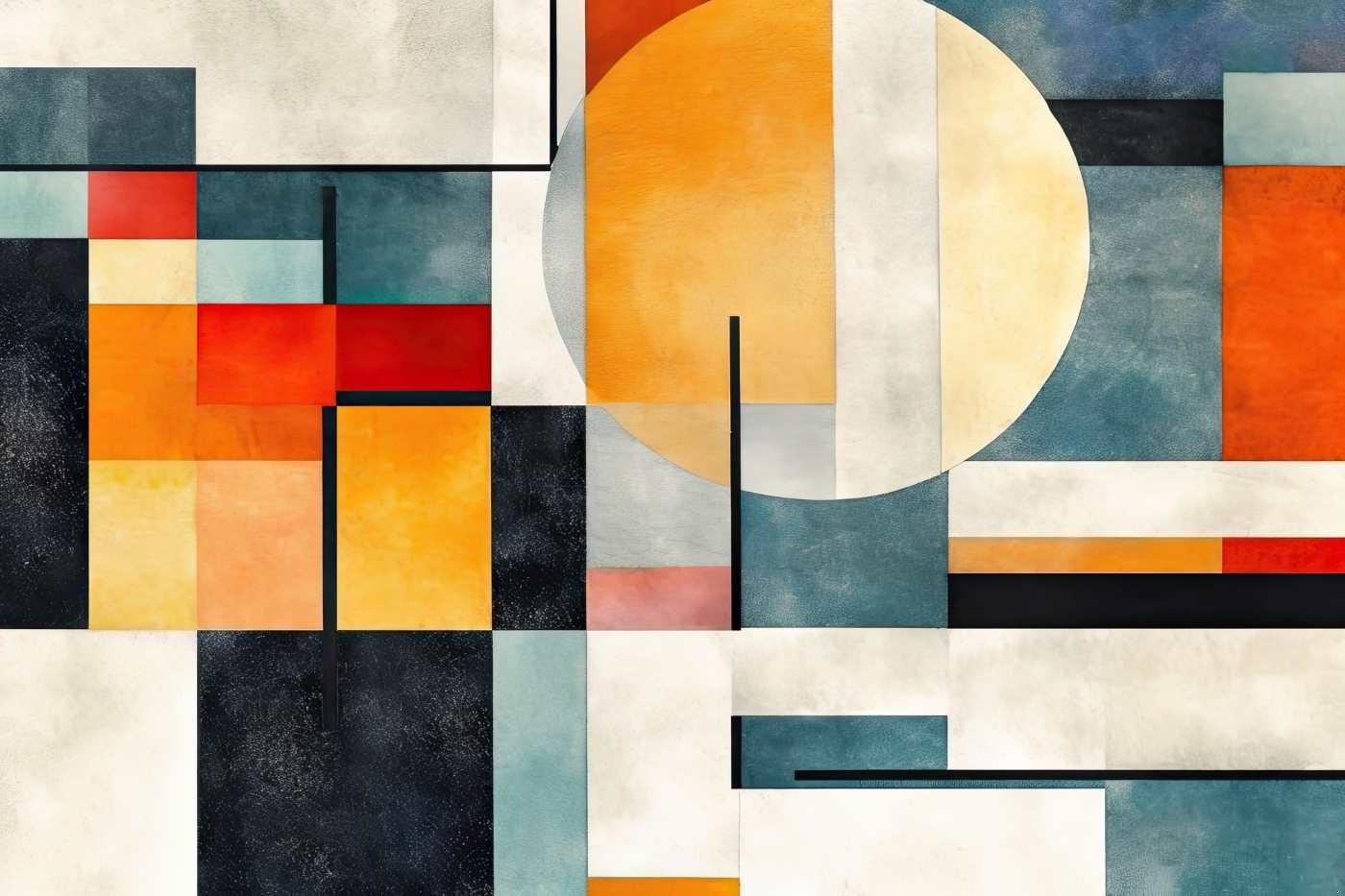 Dieses geometrische Wandbild zeigt eine kühne Komposition aus architektonischen Formen und auffälligen Farbblöcken. Das Design verfügt über ein dominantes kreisförmiges Motiv in warmen gold-orange Tönen, ausbalanciert durch tiefe Petrolakzente und klare schwarze Linien. Die moderne abstrakte Tapete erzeugt ein rhythmisches Zusammenspiel von Formen mit präzisen geometrischen Winkeln und sauberen sich kreuzenden Linien, die die Raffinesse der Bauhaus-Designprinzipien hervorrufen.