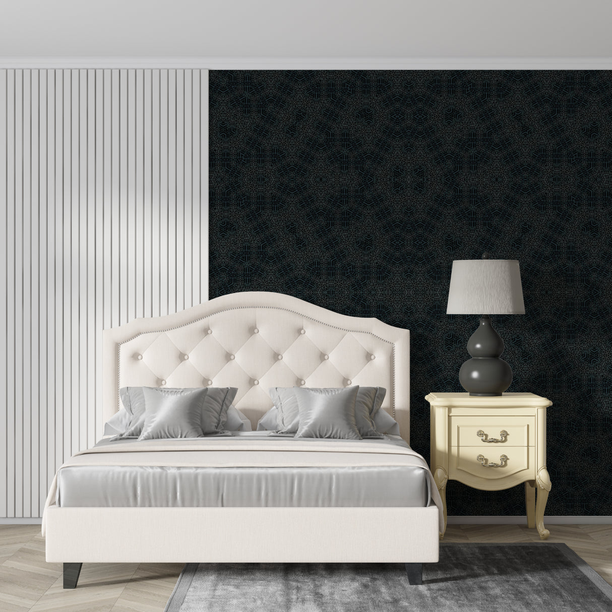 Diese geometrische Tapete zeigt eine komplexe Matrix aus miteinander verbundenen Linien und Formen und schafft ein raffiniertes Labyrinth aus Art-Déco-Mustern. Der tiefschwarze Hintergrund bietet eine dramatische Leinwand für die subtilen, labyrinthartigen Motive, die sich durch das Design ziehen und einen faszinierenden Tiefeneffekt erzeugen, der das Auge in seine komplexe geometrische Harmonie zieht.