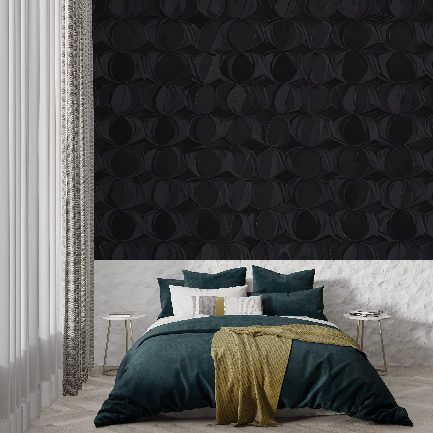 Verwandeln Sie Ihren Raum mit dieser schwarzen Muster-Tapete, die Tiefe und Raffinesse in moderne Innenräume bringt. Das geometrische Reliefdesign dient als ideale Kulisse für sowohl minimalistische als auch luxuriöse Einrichtungskonzepte und schafft eine Atmosphäre von verfeinerter Eleganz. Ob in einem modernen Wohnzimmer oder einem anspruchsvollen Schlafzimmer eingesetzt, fügt diese Tapete eine Schicht architektonischen Interesses hinzu und bewahrt dabei ein Gefühl von zurückhaltendem Luxus.