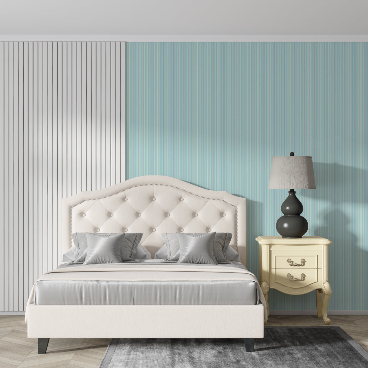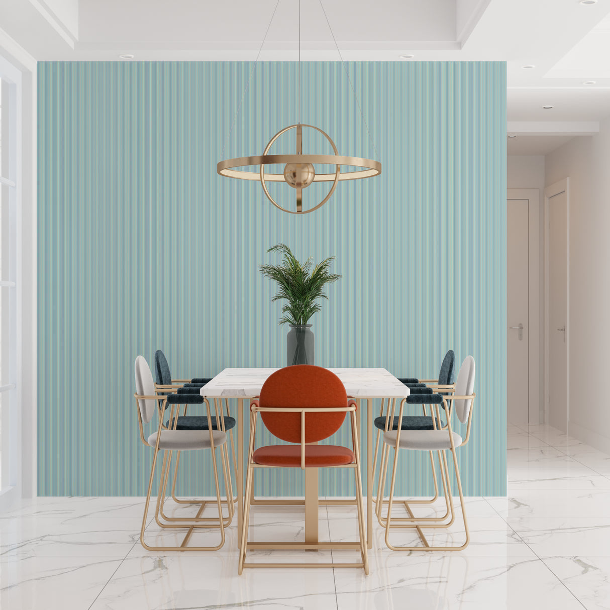 Diese minzgrüne gestreifte Tapete zieht den Blick natürlich nach oben.