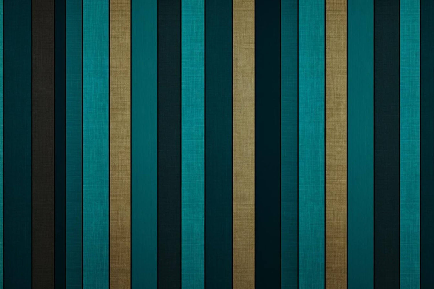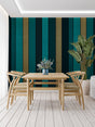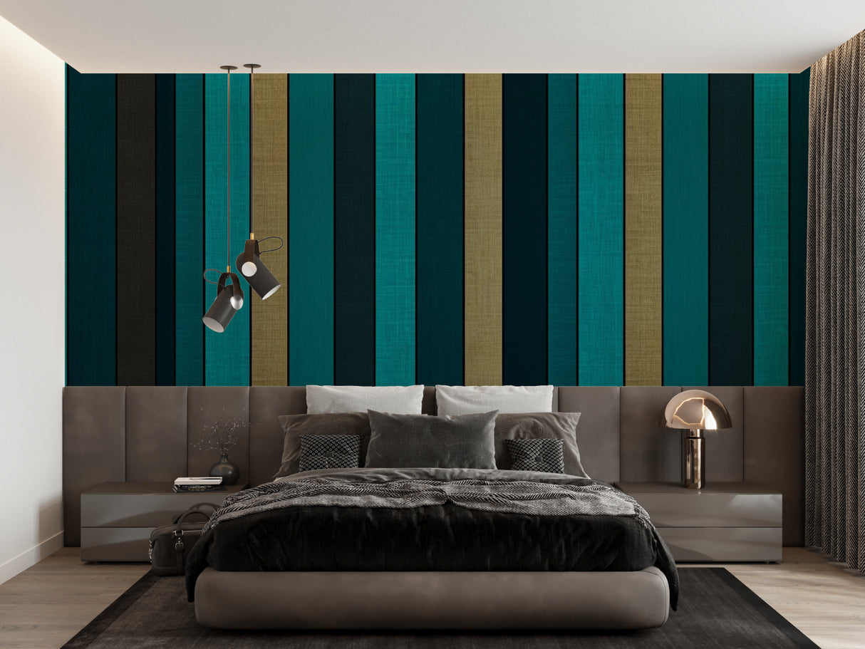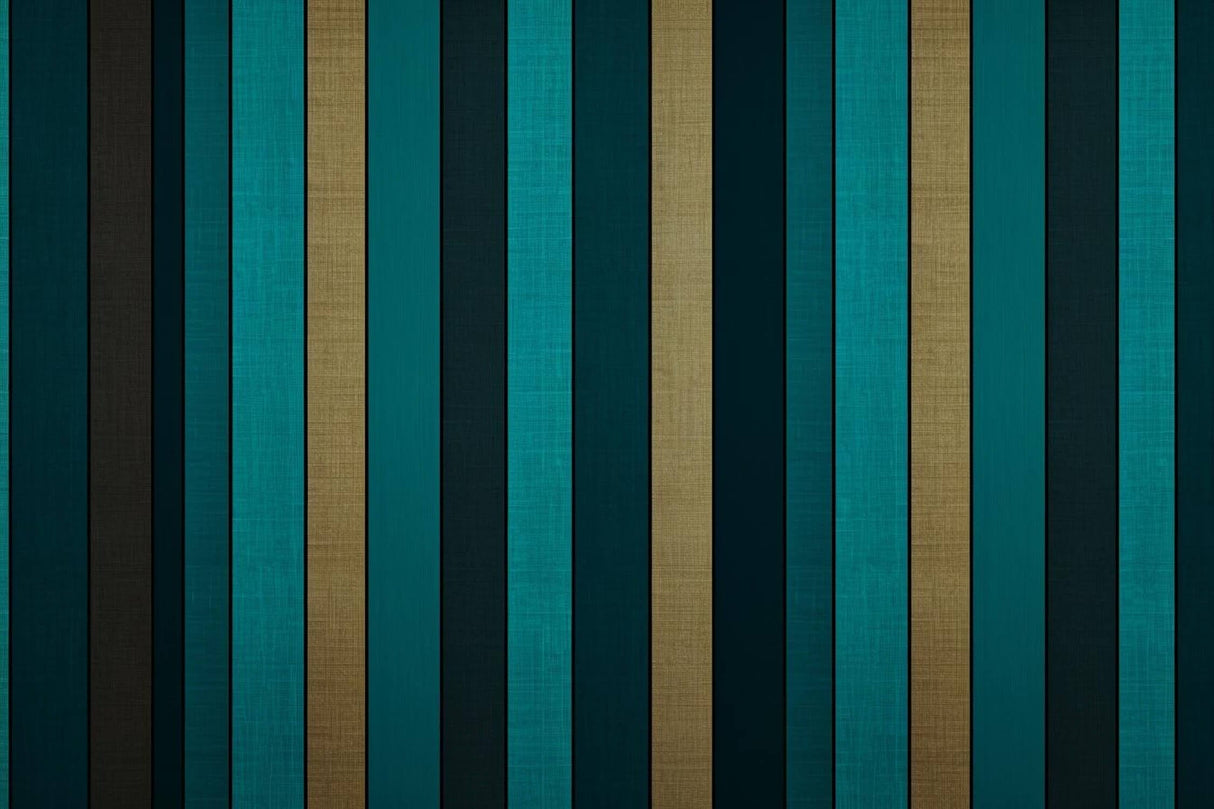 Diese gestreifte Wandbildtapete zeigt ein kühnes Zusammenspiel von türkisfarbenen und goldenen vertikalen Streifen, die einen raffinierten Rhythmus aus Farbe und Textur schaffen. Die luxuriöse Mischung aus tiefen smaragd-türkisfarbenen Streifen, die mit metallischen goldenen Akzenten abwechseln, liefert ein modernes geometrisches Tapetendesign, das zeitgenössische Eleganz verkörpert. Jeder Streifen weist eine subtile Leinenstruktur auf, die der Gesamtkomposition Tiefe und Raffinesse verleiht.