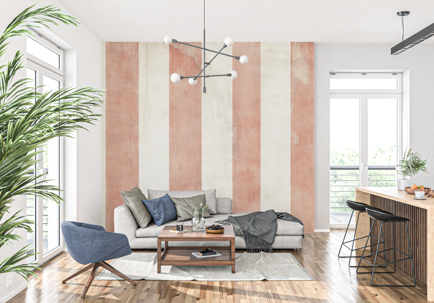 Diese vertikal gestreifte Tapete zeigt ein raffiniertes Zusammenspiel von Terrakotta- und Cremetönen und schafft eine kühne, aber dennoch elegante ästhetische Aussage. Die verwitterte Textur verleiht den breiten vertikalen Streifen Charakter, während der warme Terrakotta-Ton eine natürliche, erdige Ausstrahlung hat, die einen schönen Kontrast zu den weichen Creme-Streifen bildet. Die moderne gestreifte Tapete vermittelt durch ihr sanft gealtertes Finish ein Gefühl künstlerischer Handwerkskunst.
