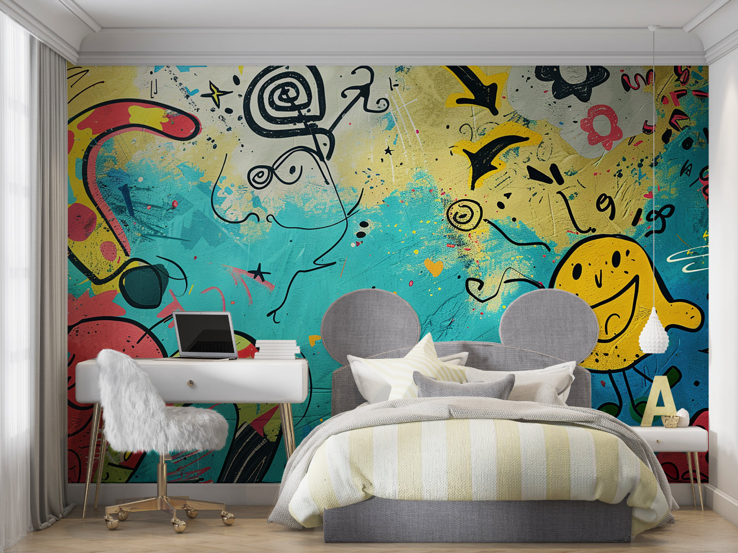 Diese lebendige Street-Art-Tapete zeigt eine dynamische Explosion urbaner Kreativität vor einem auffälligen türkisfarbenen Hintergrund. Kräftige gelbe Smiley-Gesichter, abstrakte Spiraldesigns und verspielte Linienkunst verbinden sich mit Spritzern von Koralle und Schwarz zu einem energetischen Graffiti-Wandbild-Design. Die künstlerische Komposition zeigt verspielte Figuren und spontane Elemente, die in einer harmonischen Mischung aus Straßenkultur und zeitgenössischer Kunst über die Wand tanzen.