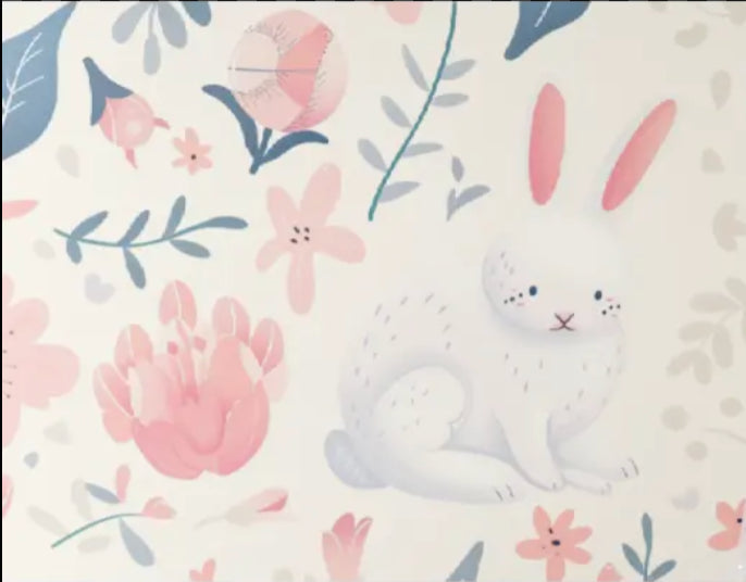 Kaninchen Tapete | Florales Kinderzimmerdesign mit rosa Blüten