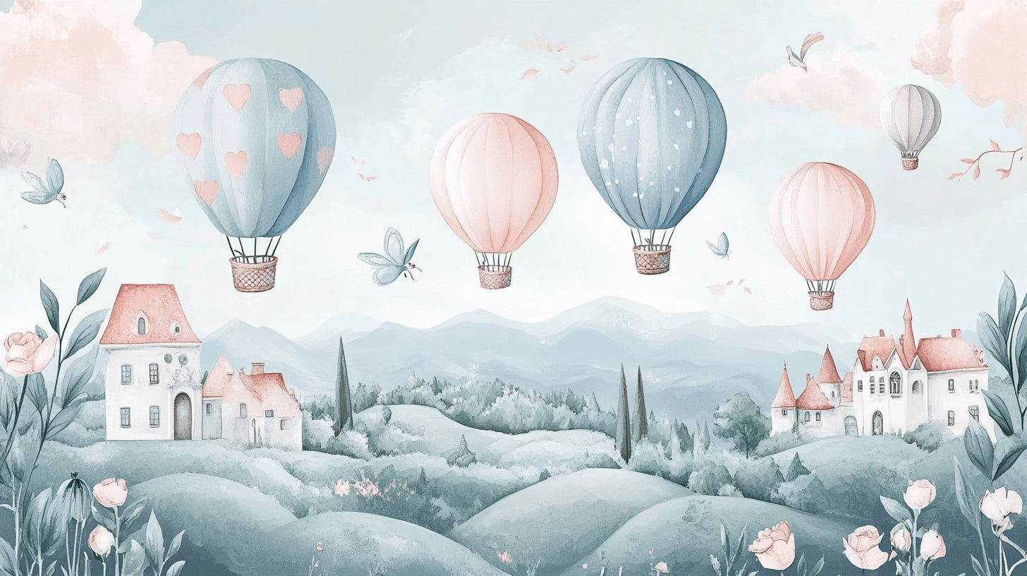 Diese bezaubernde Heißluftballon-Tapete fängt eine verträumte Landschaft ein, in der Fantasie auf Eleganz trifft. Sanft-rosa und puderblaue Ballons schweben anmutig über einem nebligen Himmel, geschmückt mit zarten Herzen und subtilen Mustern. Darunter entfaltet sich ein ruhiges Panorama mit sanften Hügeln, Zypressenbäumen und charmanten Märchenhäuschen in sanften Korallrosa-Tönen, die eine harmonische Szene schaffen, in der Schmetterlinge zwischen blühenden Blumen tanzen.