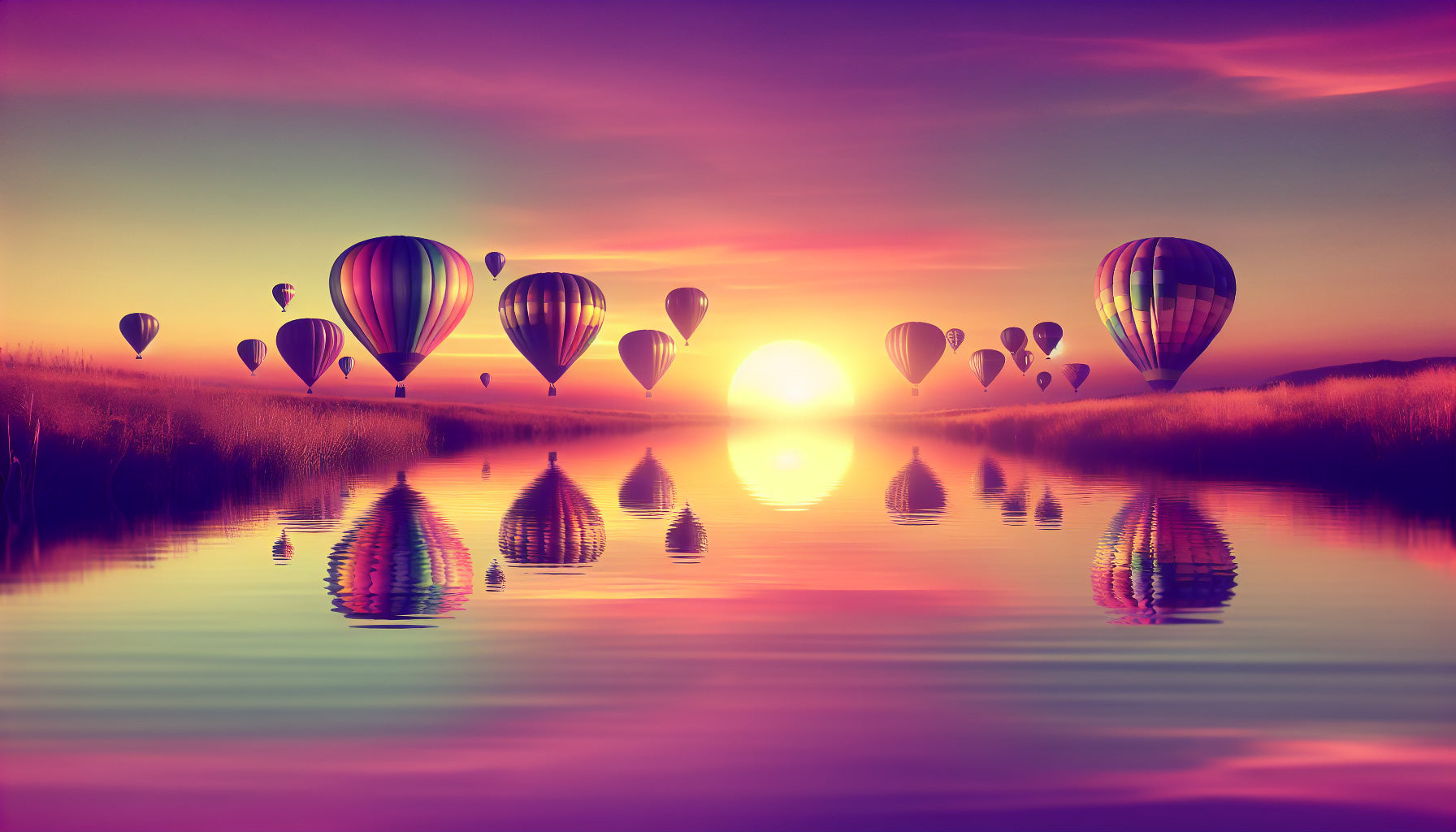 Diese Heißluftballon-Tapete fängt eine faszinierende Sonnenuntergangsszene ein, in der lebendige Ballons anmutig über einen lila-pinken Himmel schweben. Die magische Landschaft zeigt mehrere bunte Heißluftballons, die sich als Silhouetten vor einer goldenen Sonne abzeichnen, deren Formen sich perfekt in den stillen Gewässern darunter spiegeln. Die Farbpalette wechselt von tiefem Violett zu warmen Orange- und Gelbtönen und schafft eine traumhafte Atmosphäre, die zwischen Tag und Nacht zu schweben scheint.