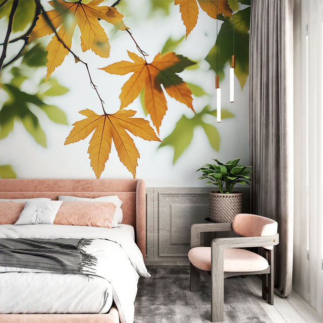 Diese Tapete mit Herbstblättern fängt die ätherische Schönheit des Ahornlaubs in seiner saisonalen Spitzenverwandlung ein. Gold-orangefarbene Ahornblätter tanzen vor einem sanften, leuchtenden Hintergrund und schaffen ein fesselndes Spiel von Licht und Schatten. Die zarte Aderung jedes Ahornblatt-Tapetendetails bringt die Kunst der Natur ins Innere, während Hinweise auf frisches grünes Laub dieser botanischen Komposition Tiefe und visuelles Interesse verleihen.