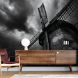 Diese auffällige schwarz-weiße Windmühlen-Tapete fängt die rohe Kraft des industriellen Erbes in einer meisterhaft komponierten monochromen Szene ein. Die dramatische Silhouette der traditionellen Windmühle erhebt sich majestätisch vor turbulenten Sturmwolken und schafft ein intensives Spiel von Licht und Schatten. Die strukturierte Backsteinstruktur und die geometrischen Muster des industriellen Wandbildes zeigen außergewöhnliche architektonische Details, während der stimmungsvolle Himmel der Komposition eine atmosphärische Tiefe verleiht.
