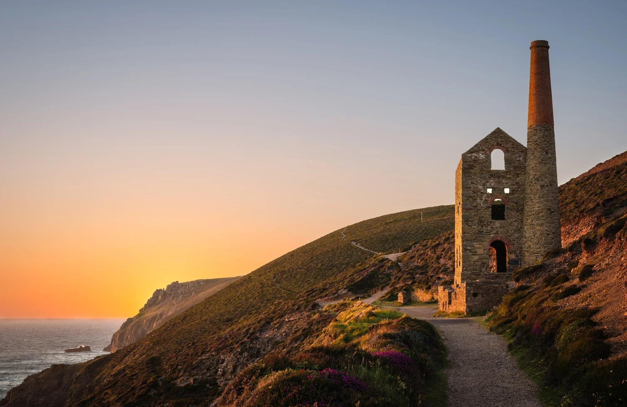 Diese industrielle Landschaftstapete fängt die eindrucksvolle Präsenz einer historischen Zinnmine vor einer faszinierenden Küstenkulisse ein. Die Steinstruktur steht stolz auf zerklüfteten Klippen, ihr verwitterter Schornstein ragt himmelwärts, während warmes goldenes Licht die Szene erleuchtet. Der natürliche Pfad, der sich durch lila Heide schlängelt, schafft eine eindrucksvolle Komposition, während die vintage industrielle Tapete die rohe Schönheit des Bergbauerbes von Cornwall zeigt.