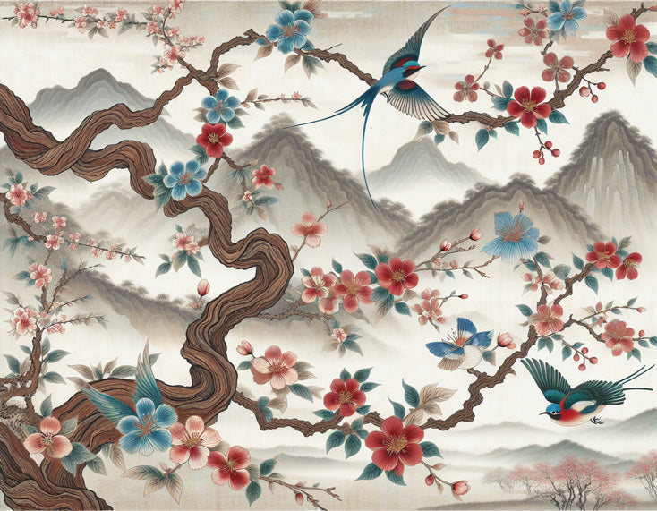 Diese japanische Kirschblüten-Tapete fängt die Essenz traditioneller asiatischer Kunst mit ihrer anmutigen Komposition aus sich windenden Zweigen und zarten Blüten ein. Der verdrehte braune Stamm schafft einen dramatischen Blickfang, geschmückt mit Kirschblüten in Korallenrosa- und Türkisblau-Tönen. Vor einem nebligen Bergpanorama schweben azurblaue Vögel mit langen Schwanzfedern anmutig und bringen Bewegung und Leben in diese ruhige Landschaft.