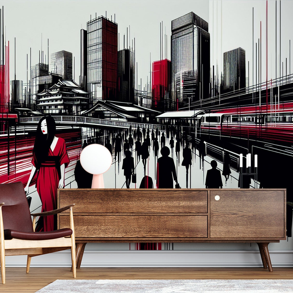 Japanische Stadt Tapete | Urbanes rotes und schwarzes Kunstwerk