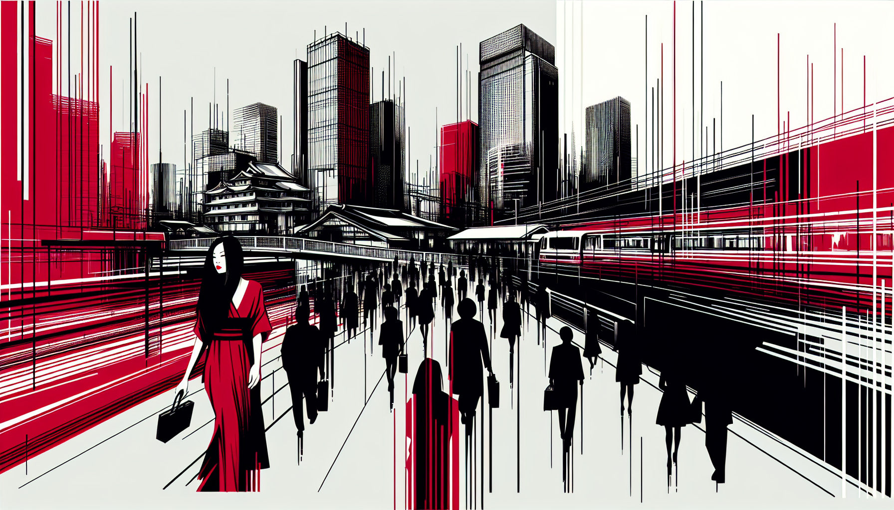 Diese japanische urbane Tapete schafft eine eindrucksvolle visuelle Erzählung, in der Modernes auf Traditionelles trifft, in einer dramatischen monochromen Palette, die durch kräftige rote Akzente unterbrochen wird. Die dynamische Stadtszenerie zeigt schlanke Wolkenkratzer und traditionelle Architektur, während geometrische Linien und Schattenspiele Tiefe und Bewegung erzeugen. Die moderne japanische Wandmalerei fängt die Essenz urbaner Energie mit ihren stilisierten Silhouetten und präzisen linearen Elementen vor einem klaren weißen Hintergrund ein.