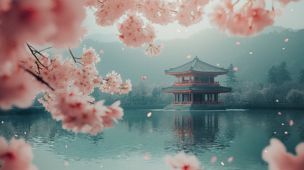 Diese japanische Tempel-Tapete fängt die ätherische Schönheit einer traditionellen Pagode ein, die auf ruhigem Wasser schwebt, eingerahmt von zarten Kirschenblütenzweigen. Die sanft-rosa Sakura-Blütenblätter tanzen vor einem nebligen türkisfarbenen Hintergrund und schaffen eine harmonische Komposition, in der Architektur auf Natur trifft. Der zweistöckige Pavillon steht als anmutiger Wächter am spiegelglatten See, seine roten Akzente bieten einen auffälligen Kontrast zur ruhigen Atmosphäre.