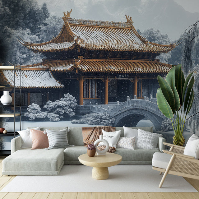 Die winterliche Pagodenlandschaft verleiht Ihren Wänden Tiefe und Charakter.