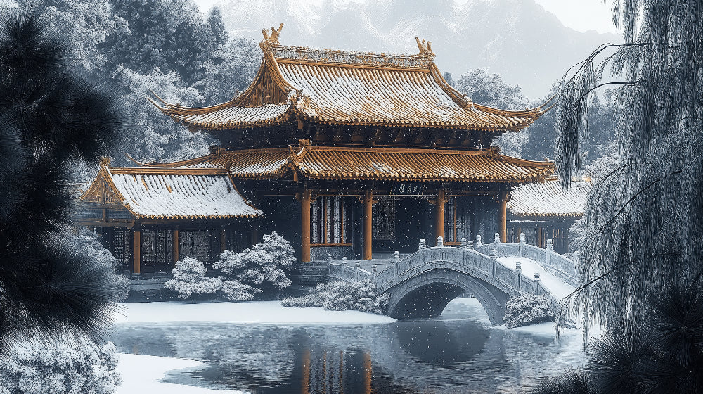 Diese japanische Tempel-Tapete fängt die ruhige Schönheit einer traditionellen Pagode vor einer nebligen Winterlandschaft ein. Die goldfarbenen Holzarchitektur des asiatischen Tempel-Wandbilds bildet einen auffälligen Kontrast zu der schneebedeckten Umgebung, während die elegante gewölbte Brücke und das reflektierende Wasser darunter Tiefe und Ruhe in die Szene bringen. Zarte Schneeflocken schweben durch die Luft und verstärken die friedliche Atmosphäre dieser zeitlosen orientalischen Aussicht.