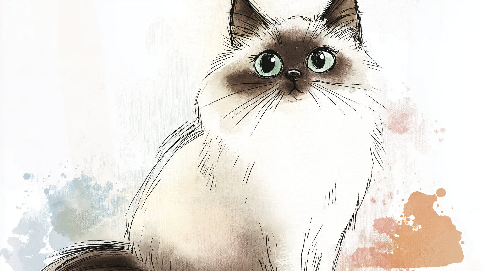 Dieses bezaubernde Katzen-Wandbild fängt die Essenz der katzenhaften Anmut mit seiner auffälligen Aquarellillustration ein. Das Herzstück zeigt eine prächtige, vom Siam inspirierten Katze mit faszinierenden grünen Augen, dargestellt in zarten Tintenstrichen und weichen Beigetönen. Die künstlerische Komposition wird durch subtile Aquarellspritzer in sanften Korallen- und Blautönen ergänzt, wodurch ein modernes Haustier-Tapete entsteht, das Raffinesse mit verspieltem Charme verbindet.
