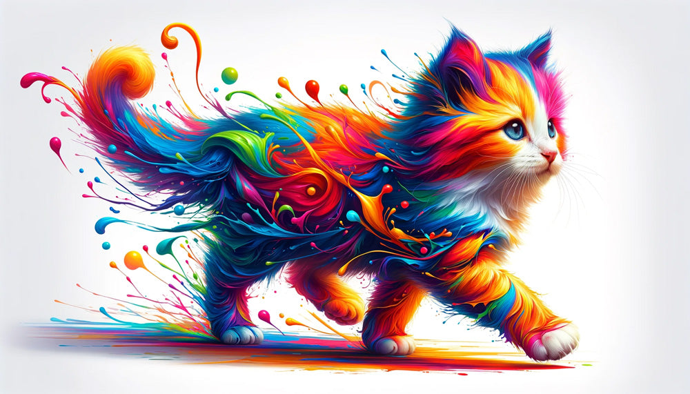 Diese bunte Katzen-Tapete zeigt eine faszinierende Verschmelzung von künstlerischem Ausdruck und katzenhafter Anmut. Eine weiße Katze mit durchdringenden blauen Augen wird zu einer lebendigen Leinwand, ihr Fell verwandelt sich in ein spektakuläres Spektrum von Regenbogenfarben, darunter lebendige Blautöne, leidenschaftliche Rottöne, leuchtendes Gelb und tiefes Violett. Dynamische Farbspritzer und wirbelnde Muster schaffen eine Regenbogen-Tier-Tapete, die scheinbar über die Oberfläche tanzt, wobei jede Farbe nahtlos in die nächste übergeht.