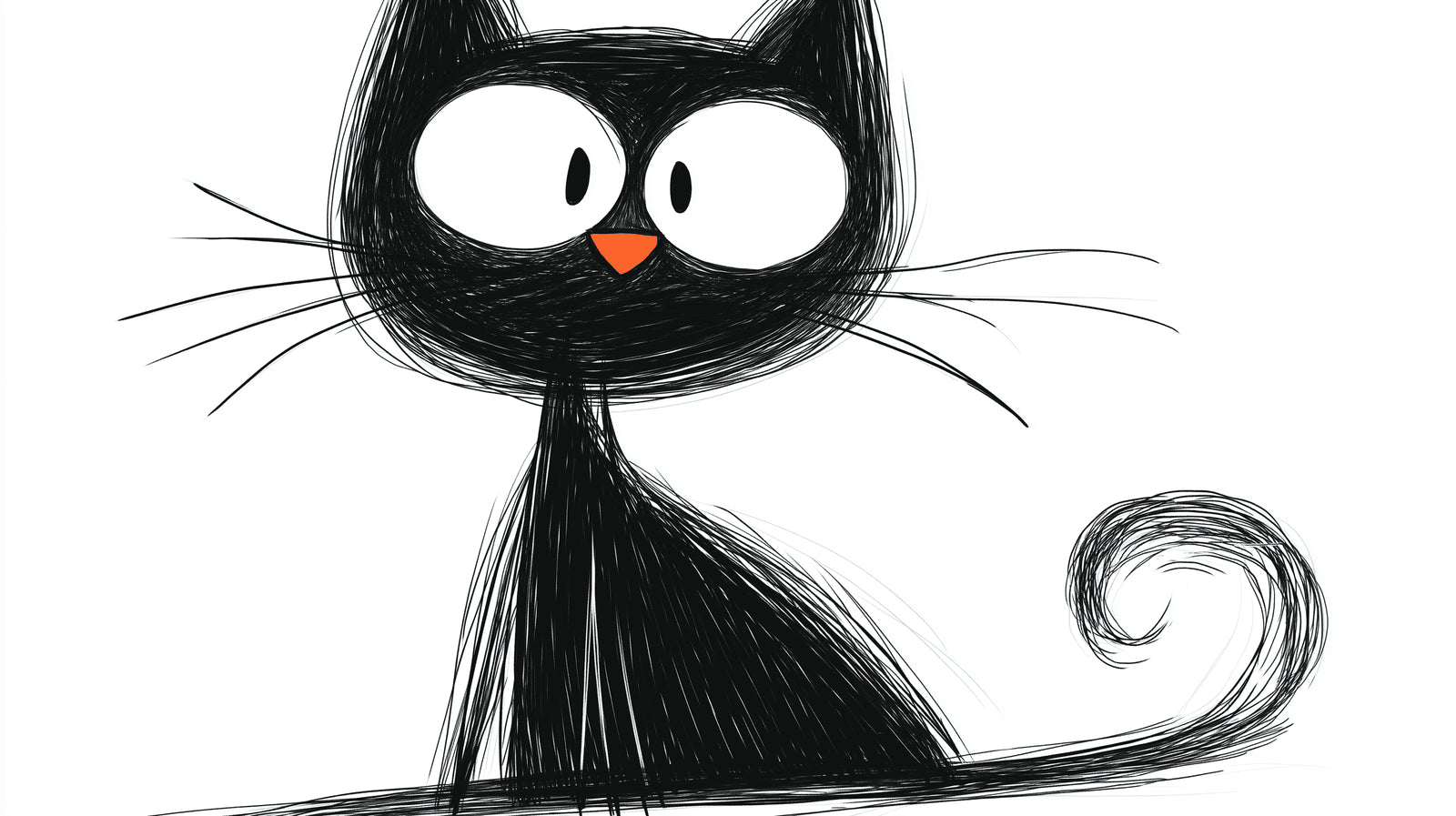 Diese charmante schwarze Katzen-Tapete zeigt einen verspielten Charakter, der durch kräftige, ausdrucksstarke Striche zum Leben erweckt wird. Die übergroße, cartoonartige Katze verfügt über fesselnde weiße Augen, eine winzige orangefarbene Nase und zarte Schnurrhaare vor einem klaren weißen Hintergrund. Das minimalistische Katzen-Wandbild verwendet eine skizzenhafte Technik, die durch dynamische schwarze Linien Bewegung und Persönlichkeit schafft, während der gekrümmte Schwanz der Komposition eine verspielte Note verleiht.