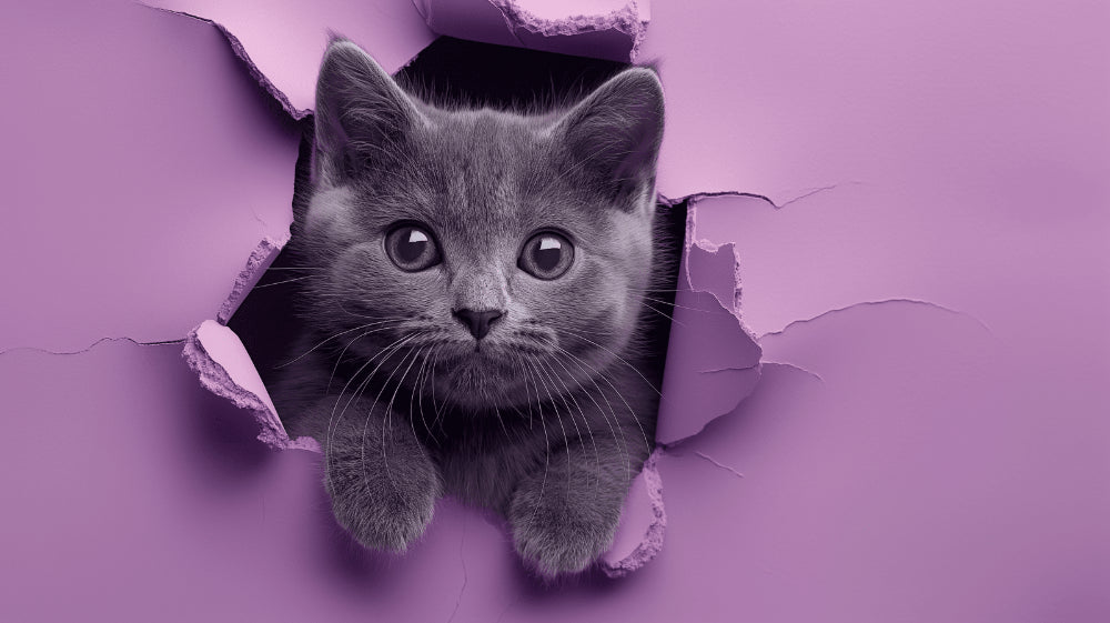 Katzen-Tapete | 3D graues Kätzchen, das durch eine lila Wand bricht