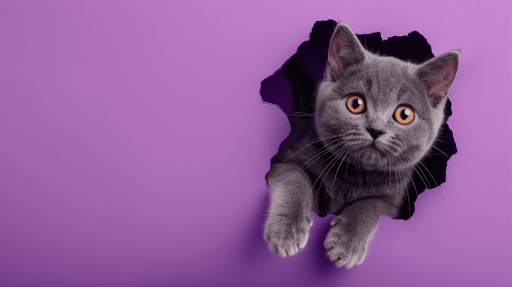 Dieses 3D-Katzen-Tapetenwandbild erzeugt eine außergewöhnliche optische Täuschung mit einem charmanten British Shorthair-Kätzchen, das scheinbar durch die Wand bricht. Vor einem satten lila Hintergrund scheint die graue Katze mit auffälligen bernsteinfarbenen Augen in Ihren Raum zu treten, eingefangen in atemberaubenden fotografischen Details. Die realistische Fellstruktur und der Tiefeneffekt dieses Haustier-Wandbildes zeigen bemerkenswerte künstlerische Präzision, während der Effekt der zerrissenen Kante die dreidimensionale Wirkung verstärkt.