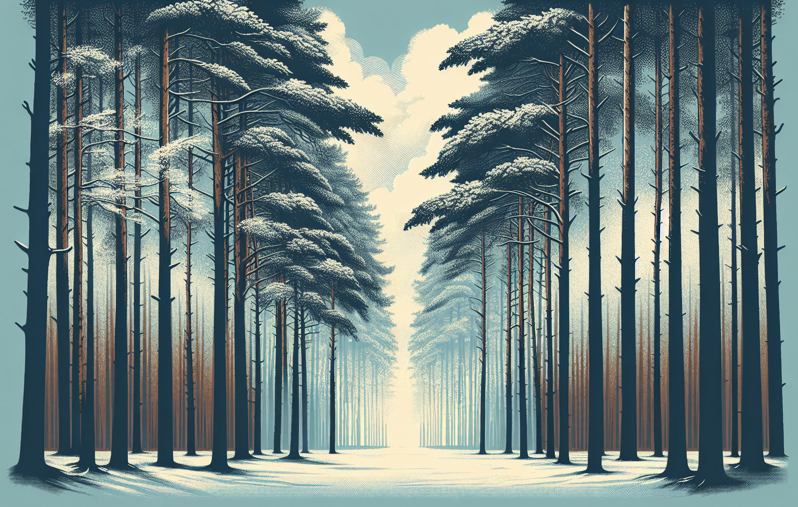 Diese Kiefernwald Tapete fängt die faszinierende Schönheit eines schneebedeckten Waldwegs ein, der sich ins Unendliche erstreckt. Hohe, majestätische Kiefern schaffen einen natürlichen Korridor, ihre Äste sind mit Winterfrost bedeckt vor einem sanften, türkisblauen Himmel. Die Wald Wandbild Tapete zeigt ein meisterhaftes Spiel von Licht und Schatten, bei dem goldenes Sonnenlicht durch die hohen Stämme filtert und eine ätherische Atmosphäre schafft, die den Blick tiefer in die Szene zieht.
