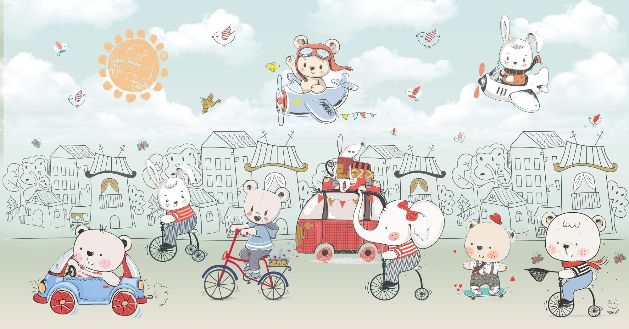 Diese Tierstadt-Tapete fängt eine entzückende Abenteuerszene ein, in der charmante Figuren vor einem sanften mintgrünen Himmel zum Leben erwachen. Verspielte Bären, Kaninchen und Jungtiere navigieren durch eine märchenhafte Stadtkulisse, einige steuern niedliche Flugzeuge, während andere Vintage-Fahrräder fahren und einen fröhlichen roten Oldtimer-LKW lenken. Die Kinder Abenteuer Tapete zeigt zarte Linienzeichnungen von Gebäuden und Bäumen, die eine perfekte Kulisse für die animierte Szene schaffen.