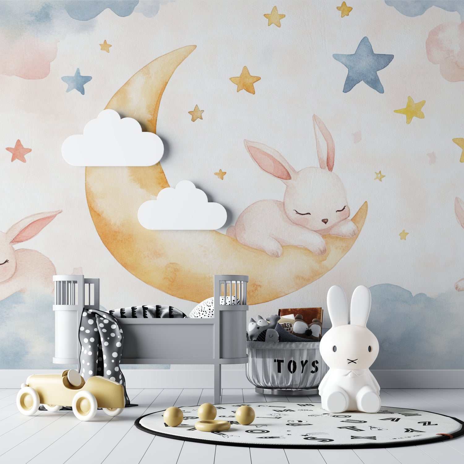 Kinder Tapete | Schlafendes Kaninchen auf goldenem Mond