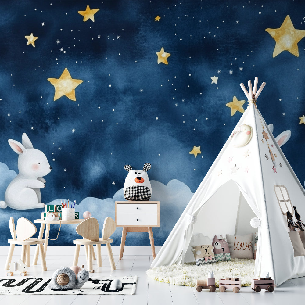 Diese Kaninchen-Kinderzimmer-Tapete erweckt Träume mit sanft leuchtenden Sternen zum Leben.