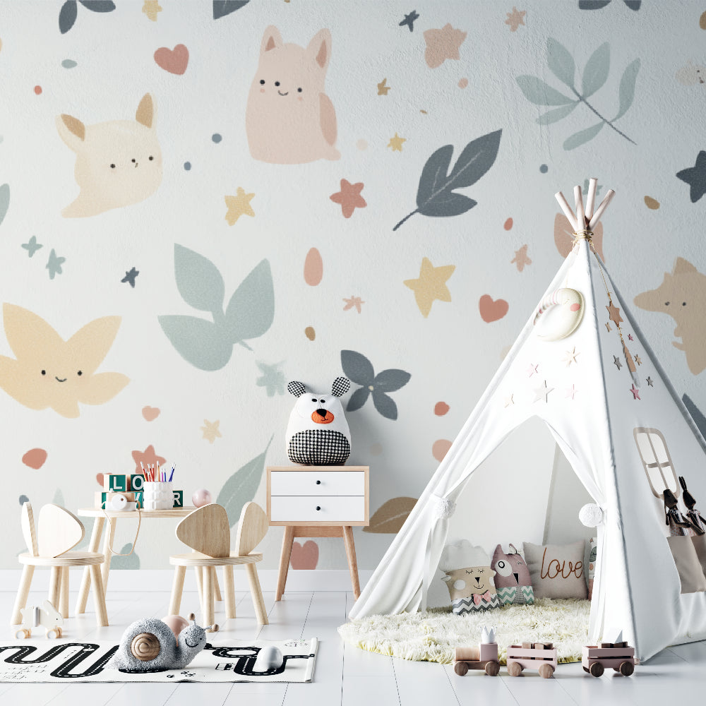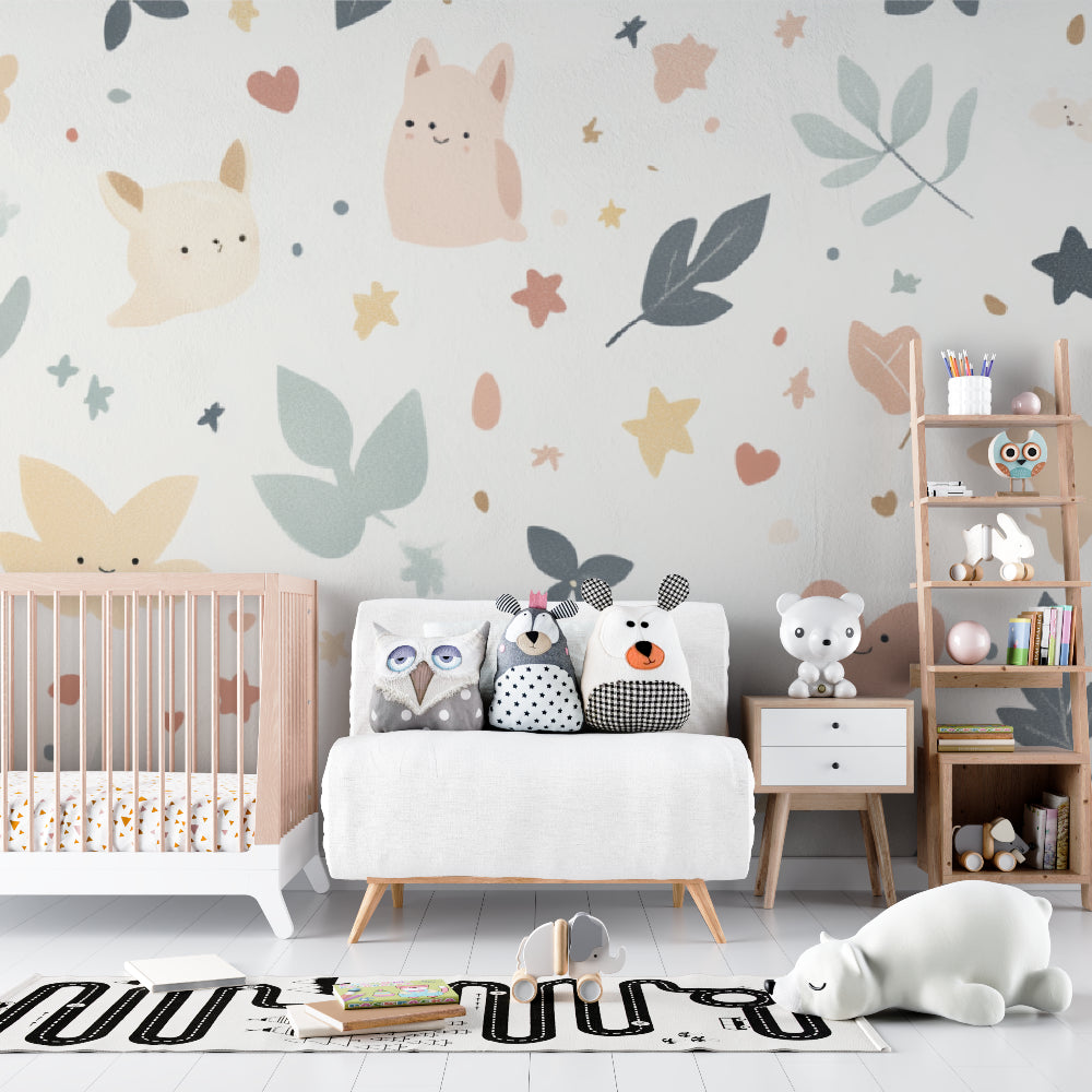 Diese bezaubernde Kinderzimmer-Tapete zeigt eine entzückende Reihe lächelnder Tierfiguren vor einem ruhigen weißen Hintergrund. Niedliche hasenähnliche Kreaturen schweben zwischen sanft getönten Blättern in Salbeigrün und Schieferblau, während goldene Sterne und korallenrosa Herzen einen magischen Schwebeeffekt erzeugen. Die Tapete für das Kinderzimmer kombiniert sanfte Pastellfarben mit verspielten Motiven zu einem verspielten und dennoch anspruchsvollen Design.