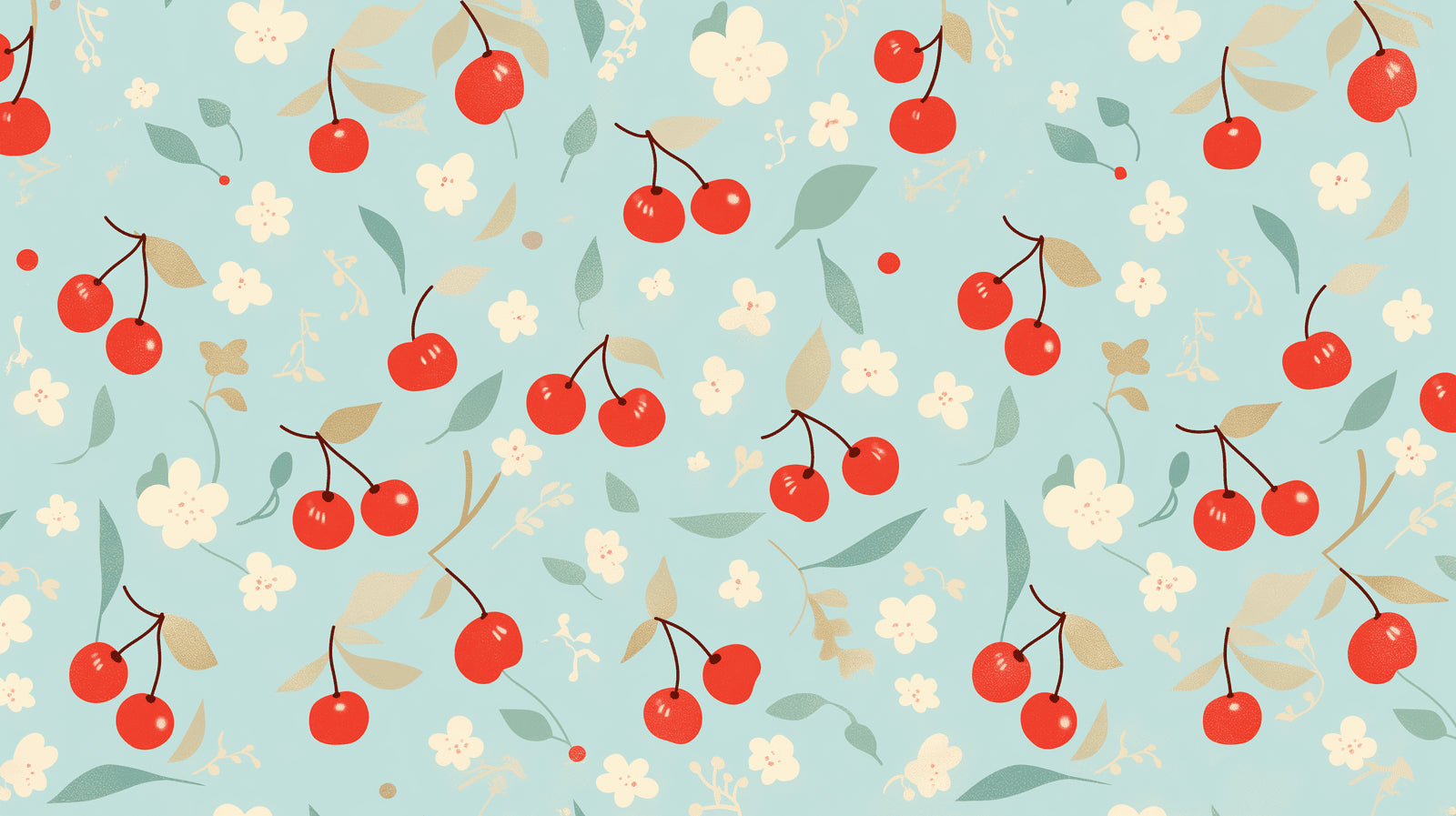 Diese Kirschenmuster-Tapete präsentiert eine entzückende Mischung aus lebendigen roten Kirschen und zarten weißen Blüten, die über einen sanften blauen Hintergrund tanzen. Das Design zeigt perfekt abgestimmte Paare glänzender Kirschen, durchsetzt mit cremefarbenen Blumen, während salbeigrüne und goldene Blätter eine sanfte, fließende Bewegung durch die vintage Obsttapete-Komposition schaffen. Jedes Element ist mit einer charmanten, retro-inspirierten Kunstfertigkeit gestaltet, die das Wesen der natürlichen Schönheit einfängt.