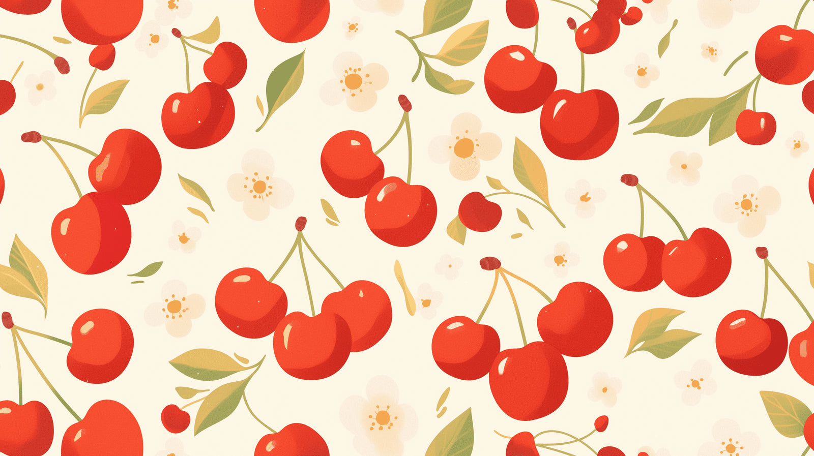 Diese Kirschenmuster-Tapete zeigt eine entzückende Anordnung von prallen, lebhaften roten Kirschen, die über einen sanften cremefarbenen Hintergrund tanzen. Jede glänzende Frucht ist mit sorgfältiger Liebe zum Detail dargestellt, komplett mit schlanken grünen Stielen und zarten Blättern. Verstreute weiße Kirschblüten mit goldenen Zentren verleihen dieser vintage Obsttapete einen Hauch subtiler Eleganz und schaffen ein harmonisches Gleichgewicht zwischen kräftigen und sanften Elementen.