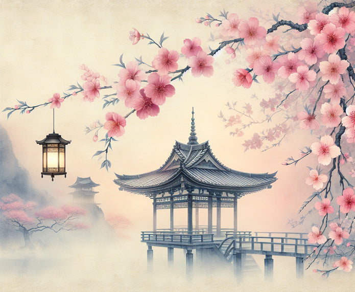 Diese japanische Kirschblüten-Tapete fängt die Essenz traditioneller asiatischer Kunst mit ihrer ätherischen Komposition ein. Zarte rosa Sakura-Blüten fallen anmutig über einen weichen beigen Hintergrund, während eine majestätische blau-graue Pagode als Mittelpunkt architektonischer Schönheit steht. Die leuchtende traditionelle Laternen-Tapete verleiht der Szene Wärme, während neblige Berge Tiefe in die ruhige Landschaft bringen.