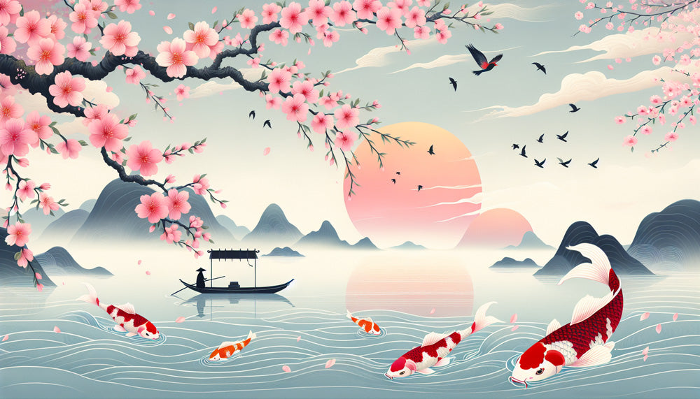 Diese japanische Kirschblüten-Tapete enthüllt eine faszinierende orientalische Landschaft, in der zarte rosa Sakura-Blüten einen ruhigen Bergsee einrahmen. Die sanft-rosa Blüten kontrastieren wunderschön mit dunklen, anmutigen Ästen, während orange und weiße Koi-Fische unter der Oberfläche der welligen Gewässer gleiten. Ein traditionelles Holzboot treibt friedlich vor einer Kulisse nebliger Berge, alles getaucht in das warme Leuchten eines roségoldenen Sonnenuntergangs, und schafft ein Kirschblüten-Wandbild von außergewöhnlicher Schönheit.