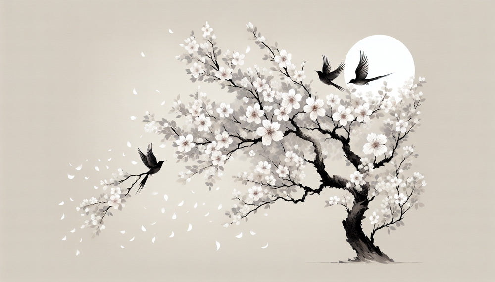 Diese Kirschblüten-Tapete fängt die Essenz eines ruhigen japanischen Gartens ein, der im Mondlicht badet. Die anmutigen Zweige des Kirschbaums erstrecken sich über einen sanften beigen Hintergrund, geschmückt mit zarten weißen Blüten, die im sanften Wind zu tanzen scheinen. Schwarze Silhouetten von Vögeln schweben vor dem leuchtenden Vollmond, während verstreute Blütenblätter durch die Luft treiben und ein japanisches Blumenwandbild von außergewöhnlicher Harmonie und Anmut schaffen.