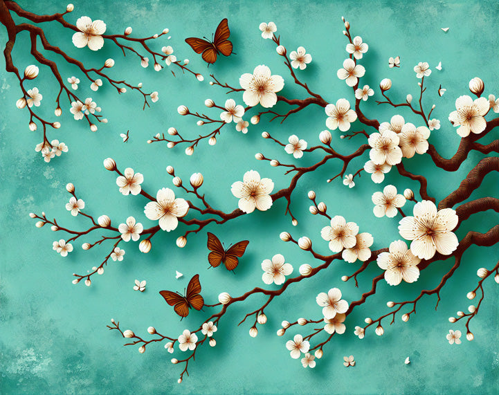 Diese bezaubernde Kirschblüten-Tapete zeigt zarte weiße Blüten, die sich anmutig über einen lebendigen türkisfarbenen Hintergrund erstrecken. Reiche braune Äste biegen und winden sich mit künstlerischer Präzision und tragen Büschel von japanischen Kirschblüten in verschiedenen Blühstadien. Kupferfarbene Schmetterlinge tanzen zwischen den Blumen und verleihen dieser exquisiten botanischen Komposition Bewegung und Leben.