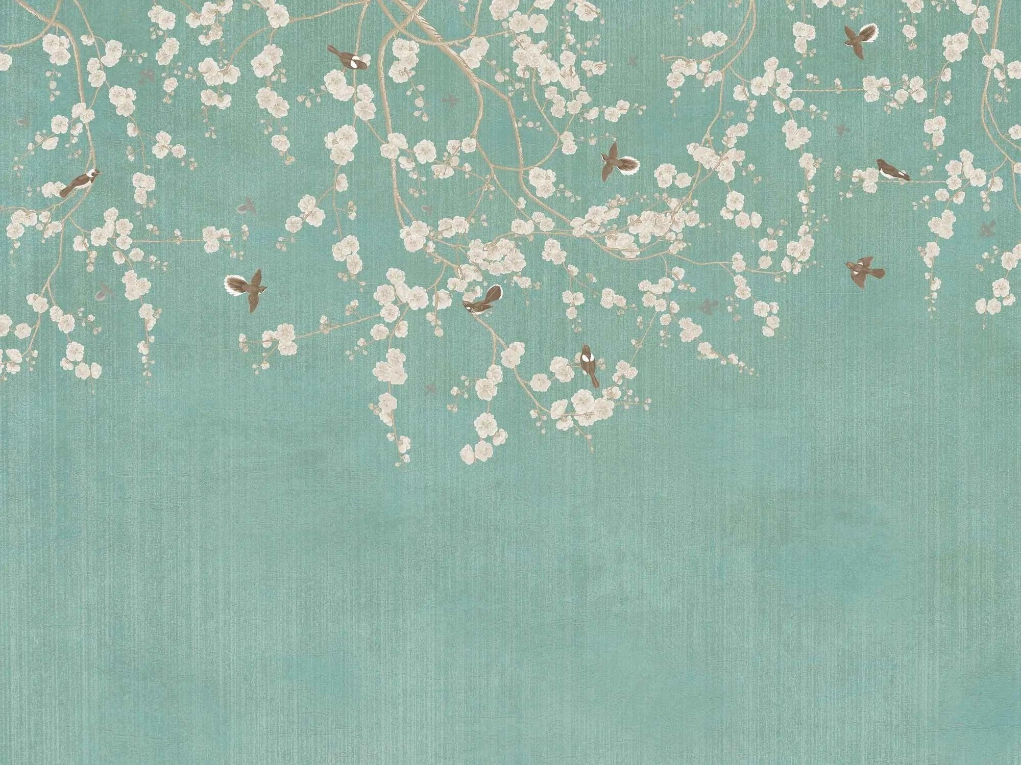 Kirschblüten Tapete | Vintage Vögel und Minzgrünes Design
