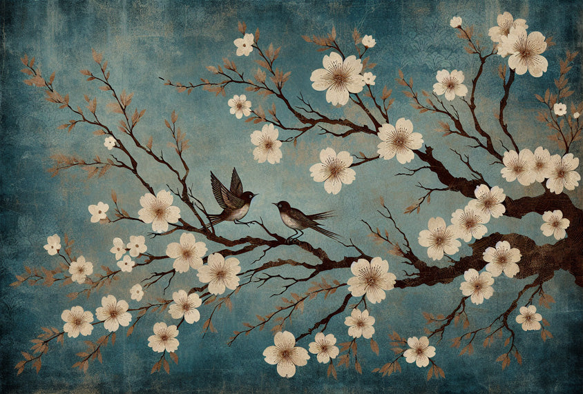 Diese Kirschblüten-Tapete fängt die ätherische Schönheit der Natur in einem anspruchsvollen Vintage-Stil ein. Vor einem satten türkisblauen Hintergrund entfalten zarte weiße Kirschblüten ihre Blütenblätter entlang anmutiger dunkler Zweige. Zwei Vögel sitzen zwischen den blühenden Sakura-Blumen und verleihen dieser bezaubernden Szene Bewegung und Leben. Der gealterte Patina-Effekt schafft Tiefe und Charakter, während die künstlerische Komposition von traditioneller japanischer Blumenmalerei inspiriert ist.