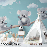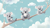 Diese bezaubernde Koala-Tapete zeigt niedliche graue Koalas, die verspielt auf Ästen sitzen vor einem ruhigen pastellblauen Himmel. Die weich strukturierten Tiere sind meisterhaft mit zarten Details dargestellt, von ihren flauschigen Ohren bis zu ihren sanften Gesichtsausdrücken, während schwebende weiße Wolken und zarte florale Elemente eine verträumte, schwerelose Atmosphäre schaffen. Die Tapete mit Tiermotiven für das Kinderzimmer verbindet Wärme und Verspieltheit in einem Design, das junge Fantasien fesselt.