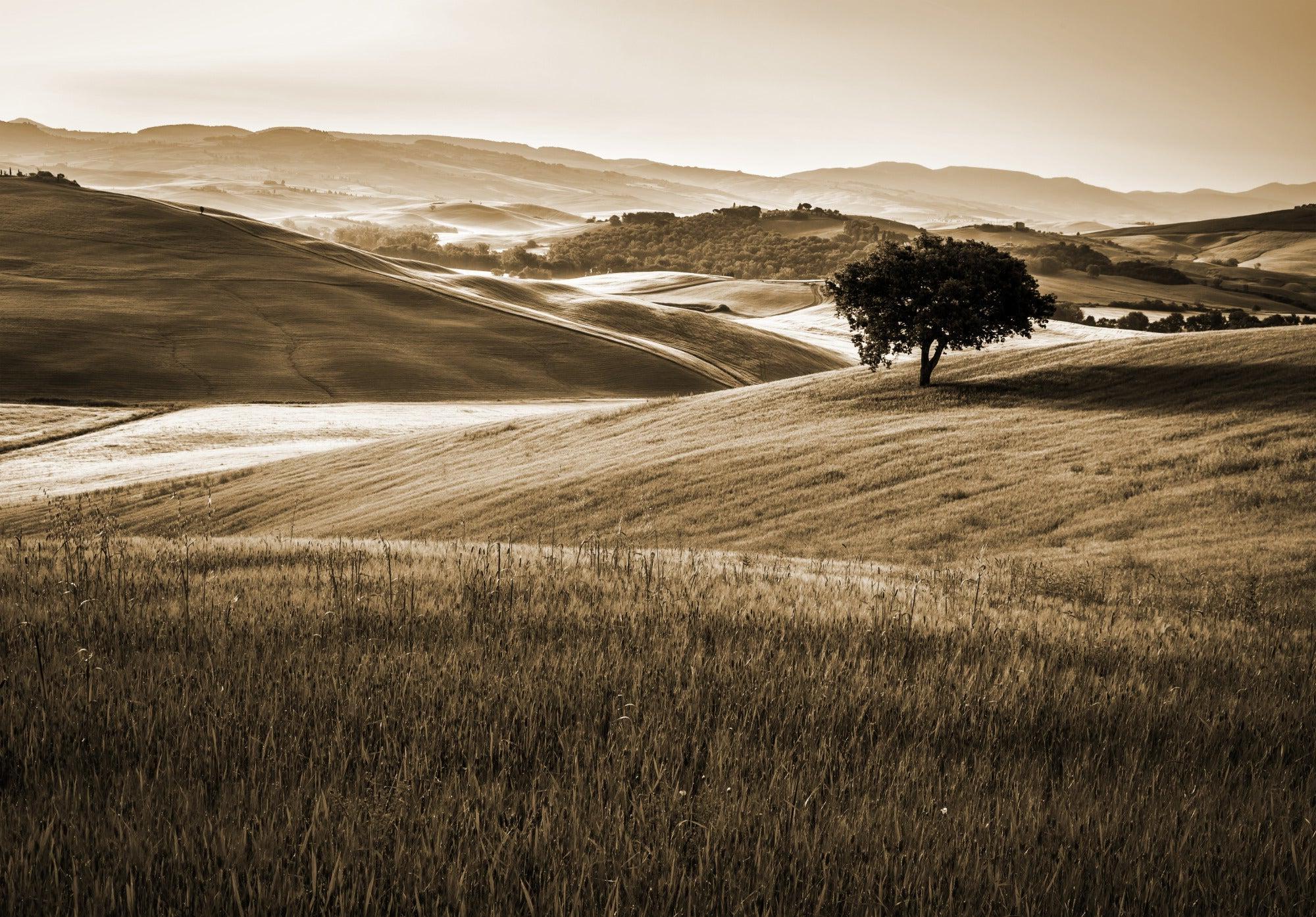 Landschafts-Tapete | Sepia toskanische Hügel mit einsamem Baum