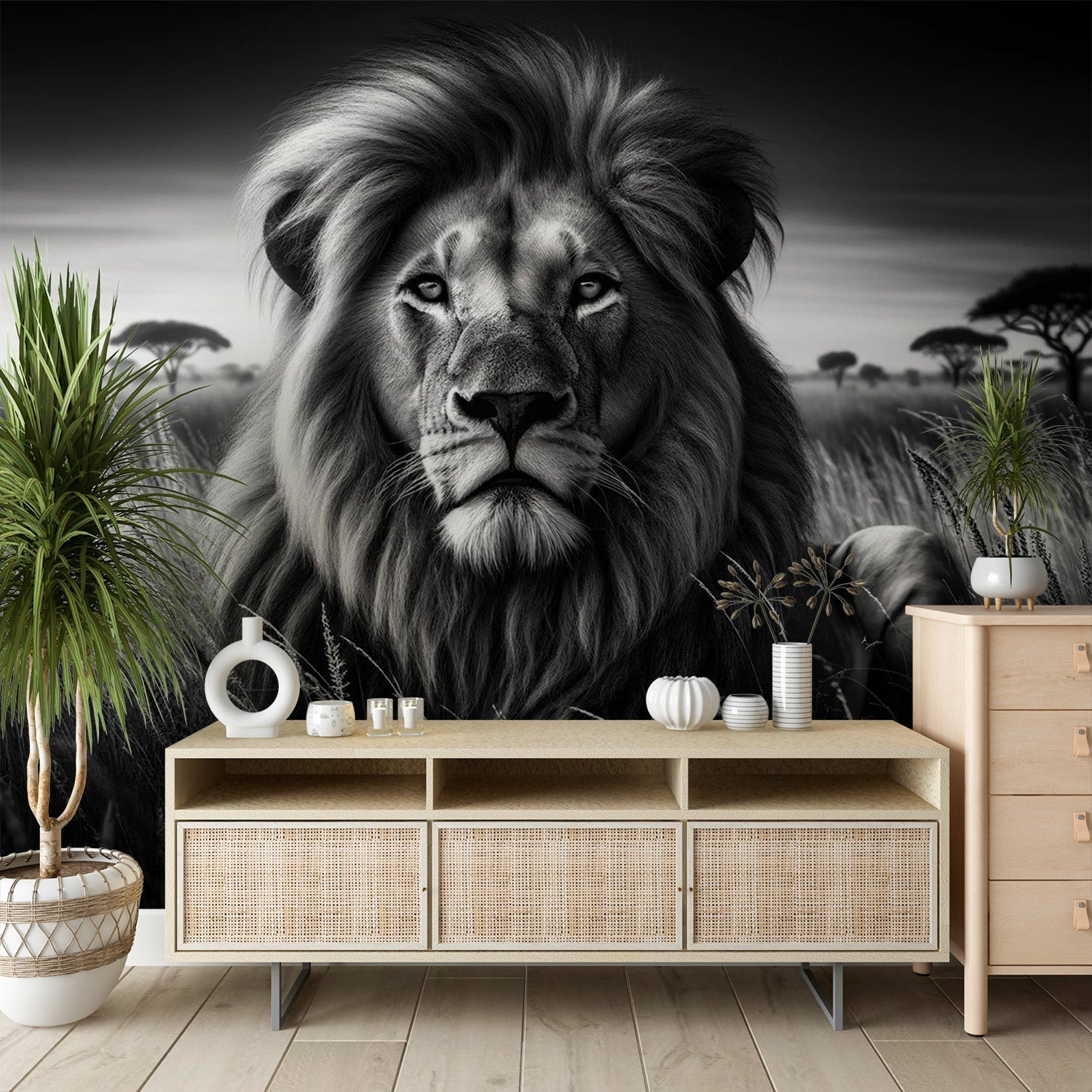Verwandeln Sie Ihren Raum mit dieser majestätischen Löwen-Tapete, die ungezähmte Eleganz in jedes Interieur bringt. Die dramatische schwarz-weiße Komposition dieses Savannen-Wildtier-Murals erzeugt Tiefe und Raffinesse und ist somit eine ideale Wahl für Räume, die Stärke und Kultiviertheit vermitteln möchten. Das kunstvolle Gleichgewicht von Licht und Schatten erzeugt eine zeitlose Ästhetik, die sich nahtlos an moderne und klassische Einrichtungskonzepte anpasst.