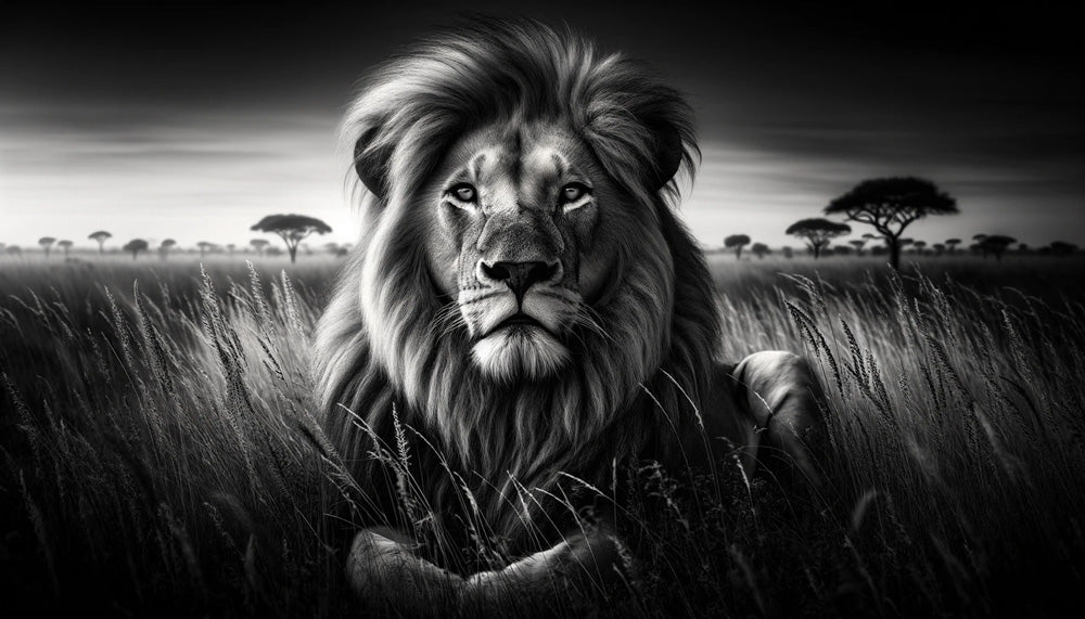 Dieses schwarz-weiße Löwen-Wandbild bringt die Kraft der Natur ins Innere.