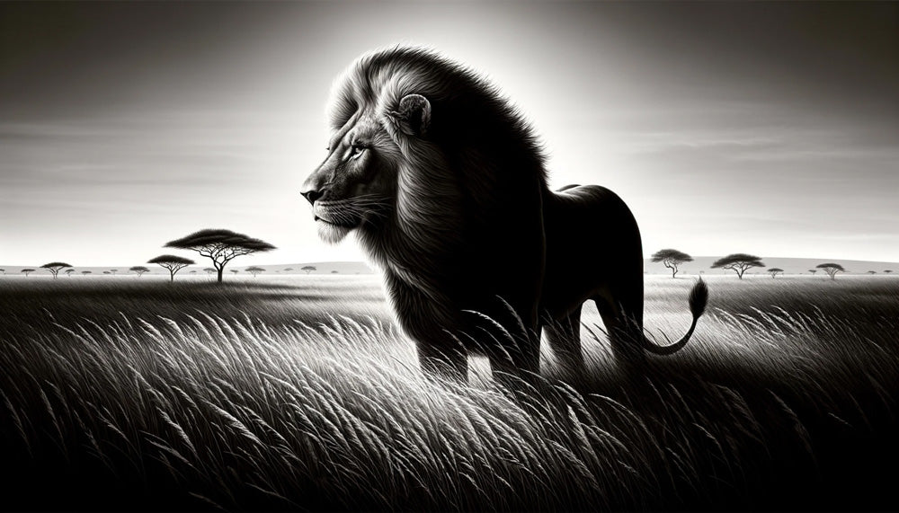 Diese schwarz-weiße Löwen-Tapete fängt die beherrschende Präsenz Afrikas majestätischstem Raubtier in eindrucksvollen monochromen Details ein. Vor der weiten Savannenlandschaft tritt das edle Profil des Löwen mit außergewöhnlicher Klarheit hervor, seine fließende Mähne und intensiver Blick in meisterhaften Graustufen dargestellt. Die künstlerische Komposition balanciert das dramatische Porträt mit den ruhigen Elementen der afrikanischen Savannen-Tapete, wo vom Wind gepeitschte Graslandschaften auf verstreute Akazienbäume am fernen Horizont treffen.