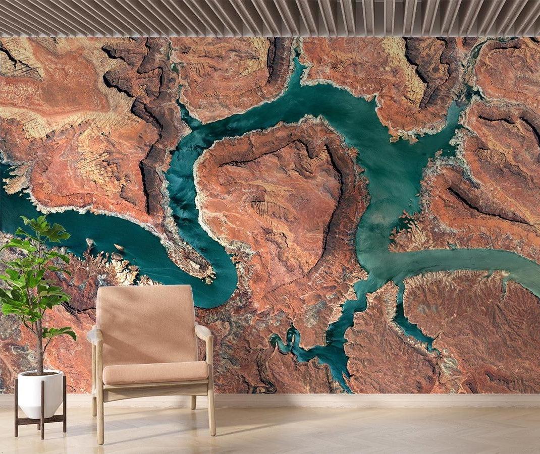 Verwandeln Sie Ihren Raum mit diesem panoramischen Natur-Mural, das jedem Interieur sowohl Tiefe als auch Raffinesse verleiht. Die Luftbildfotografie-Tapete schafft ein immersives Erlebnis und ist somit ein idealer Blickfang für moderne Wohnräume, Büros oder Gastgewerbeumgebungen. Die natürliche Farbpalette aus erdigen Rottönen und lebendigen Türkistönen bringt organische Wärme und bewahrt gleichzeitig eine zeitgemäße Ästhetik, die sich an verschiedene Designstile anpasst.