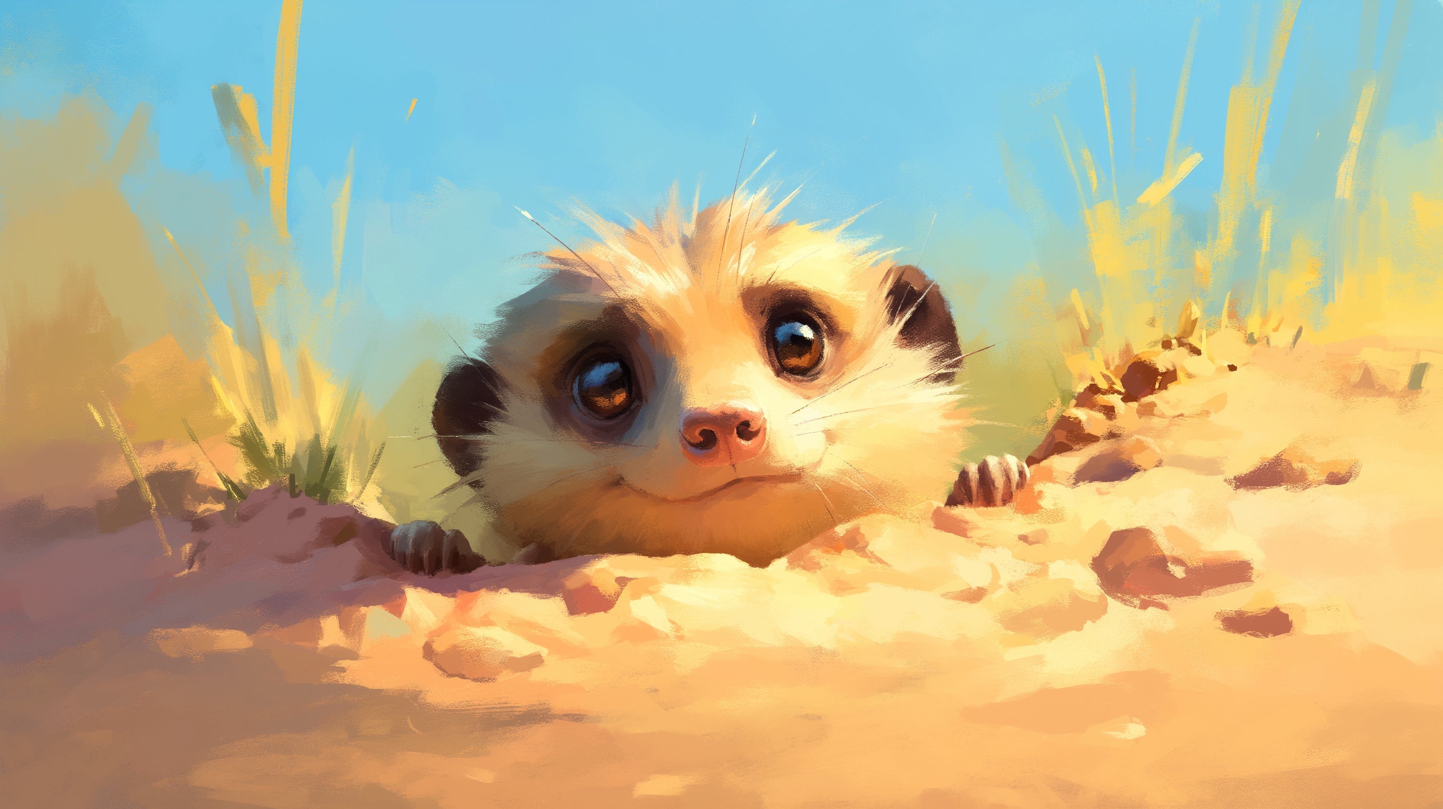 Diese bezaubernde Erdmännchen-Tapete zeigt ein charmantes Porträt eines neugierigen Wüstenbewohners, der aus goldenem Sand auftaucht. Die künstlerische Aquarelltechnik erweckt die ausdrucksvollen Augen und den sanften Gesichtsausdruck des Erdmännchens vor einem ruhigen blauen Himmel zum Leben. In sanften Pastelltönen gemalt, fängt die Wüstentier-Tapete die verspielte Natur dieser sozialen Tiere mit zarten Pinselstrichen und warmen Erdtönen ein.