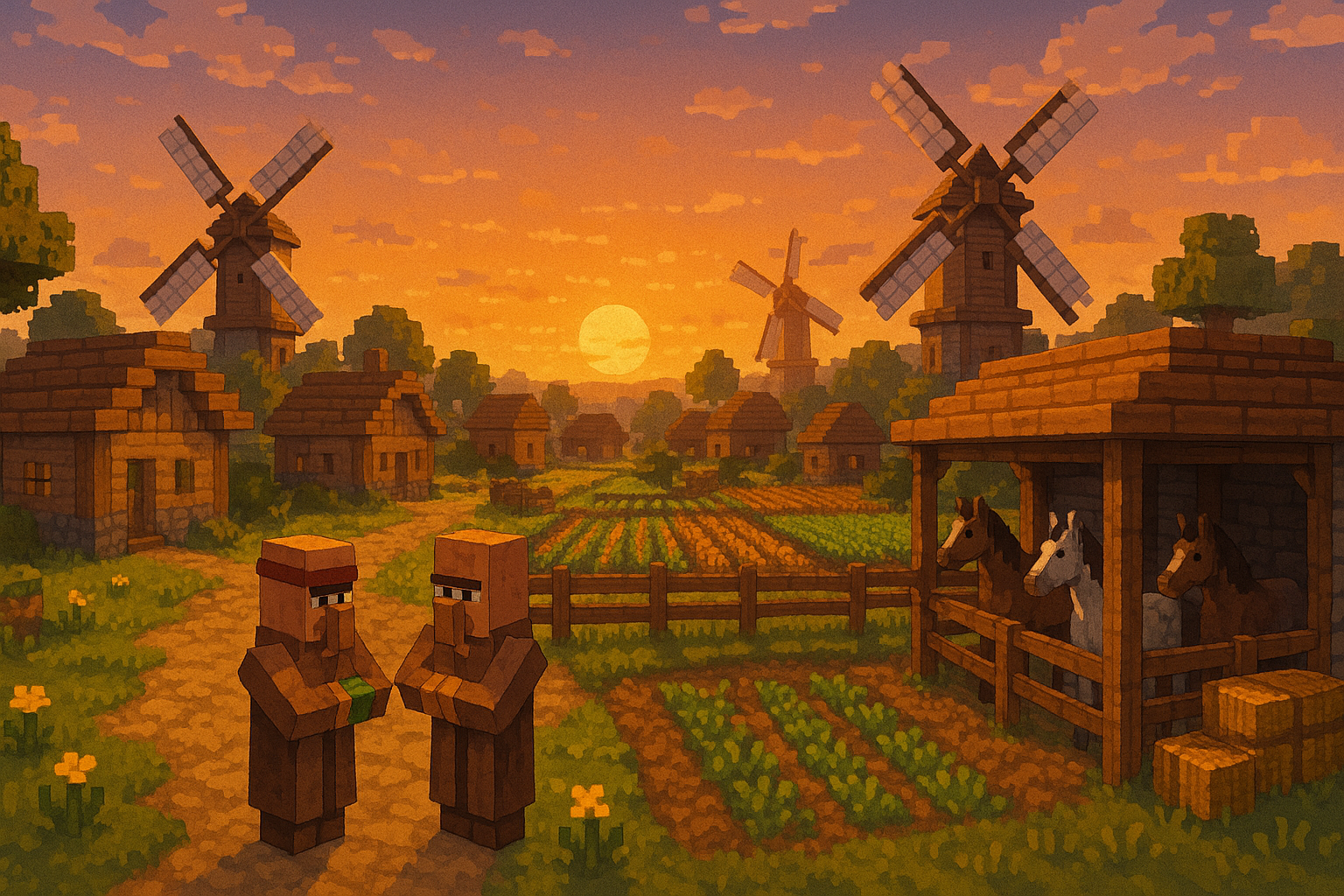 Diese Minecraft Dorf Tapete fängt eine friedliche ländliche Szene zur goldenen Stunde ein, bei der rustikale Windmühlen wie Wächter gegen einen bernsteinfarbenen Himmel stehen. Das Pixel-Art-Design zeigt traditionelle Holzbauten, Ackerfelder und Ställe mit Pferden, alle getaucht in das warme Leuchten einer untergehenden Sonne. Das Gaming Wandbild erzeugt Tiefe durch Schichten detaillierter Elemente, von den verwitterten Holzzäunen bis zu den sorgfältig kultivierten Reihen von Feldfrüchten.